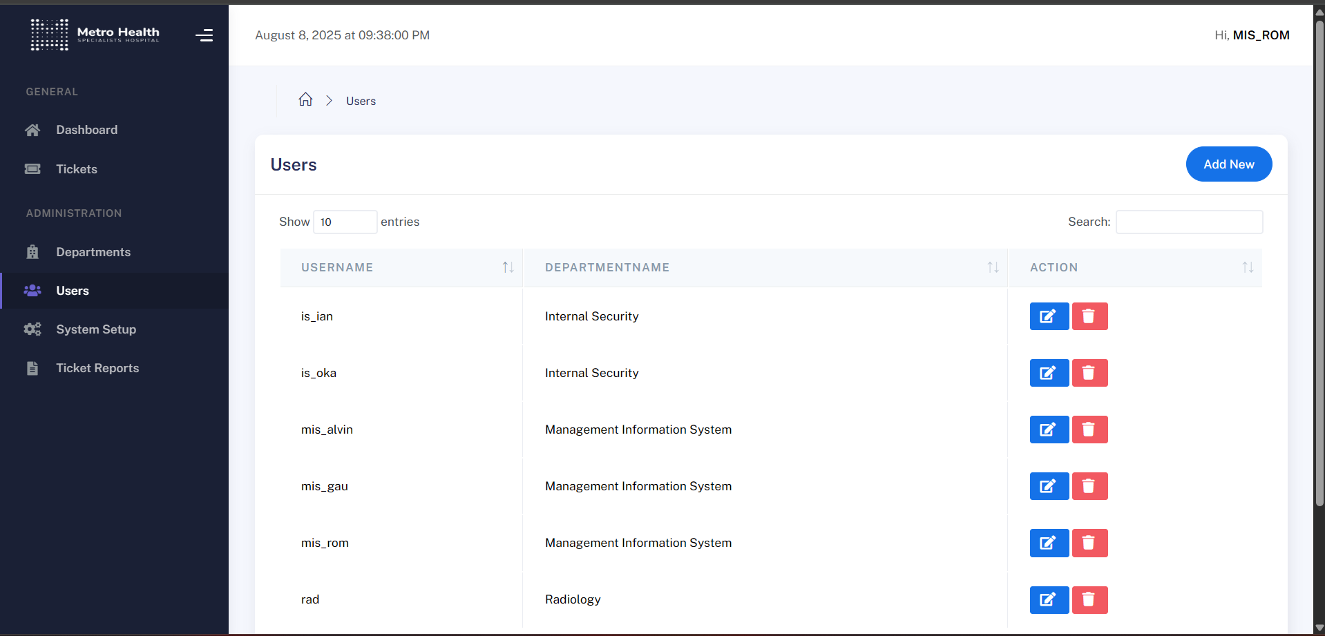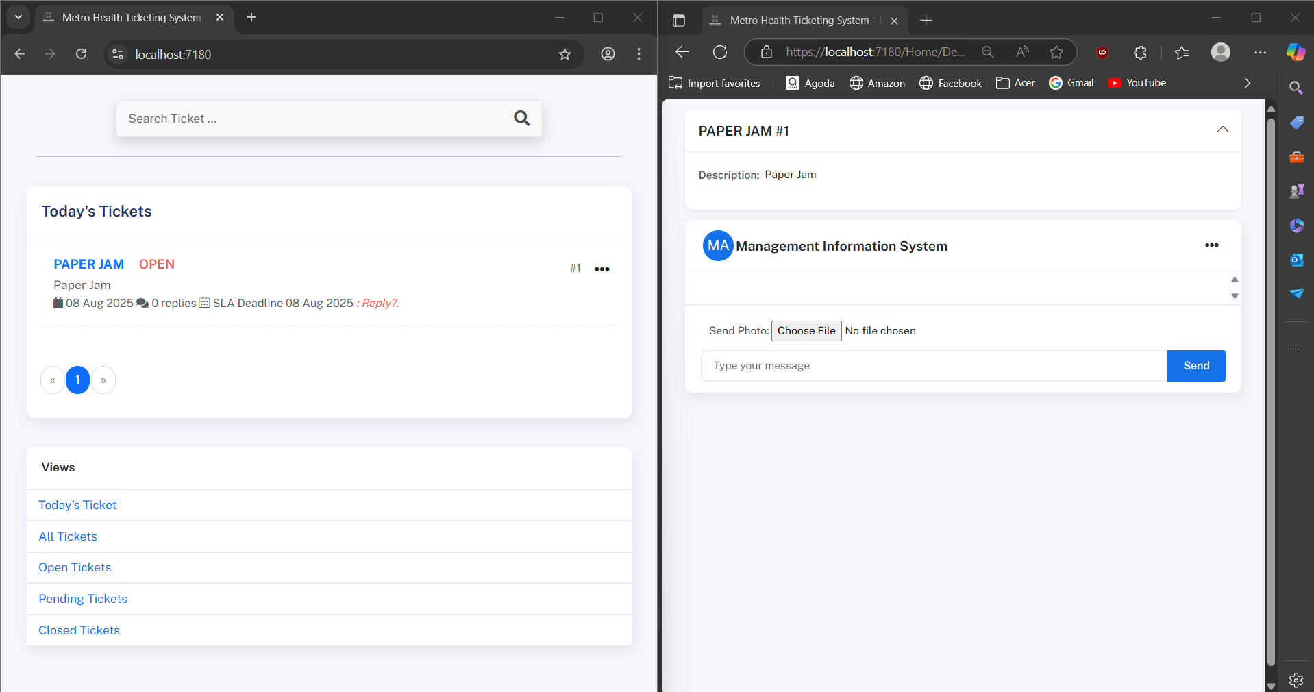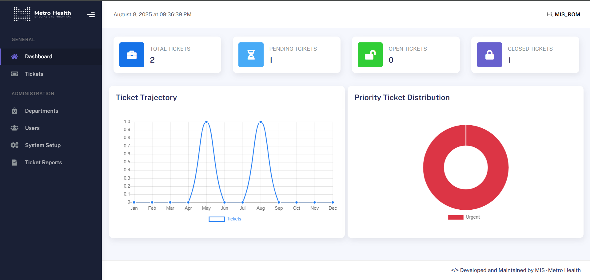 This is an in-house project I developed while working as an I.T. Support Staff at a private hospital. The system is designed to manage departmental support tickets and facilitate seamless communication between employees and the I.T. Support team. Built using ASP.NET Core MVC and MSSQL, it includes a real-time chat support feature that enables hospital staff to directly interact with I.T. personnel for faster issue resolution.